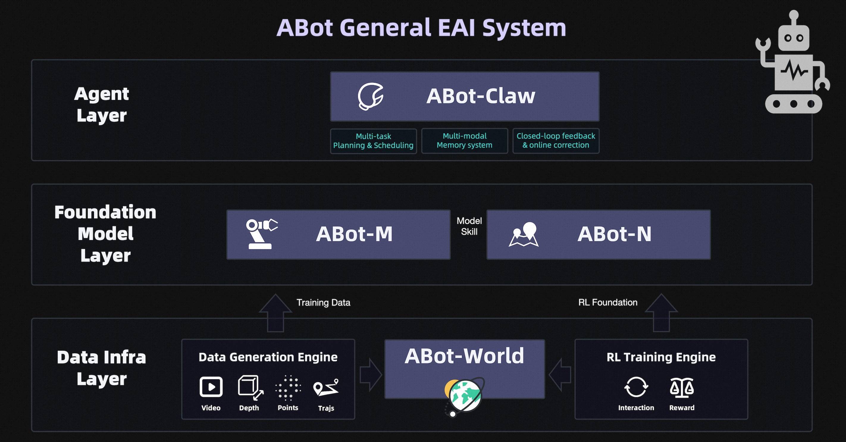 该技术体系以闭环模式运作,涵盖数据、模型与应用三层架构。据高德披露,ABot系列模型已在15项行业基准测试中取得领先成绩。在数据生成端,其底层仿真基座ABot-World采用14B DiT架构,通过在虚拟环境中合成视频、深度、点云等多种训练数据并配合强化学习引擎,以仿真数据替代高成本的真机采集,旨在降低具身智能模型的训练门槛。